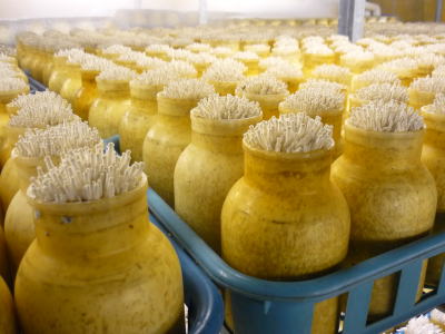 ある程度伸びてきたら光を当て太らせます。菌掻き後約3週間で収 穫可能になります。