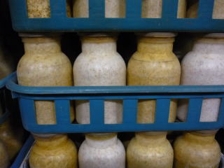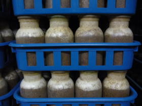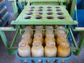 収穫後のビンを機械にかけ、中の培地を掻き出してすべての工程は 終了です。