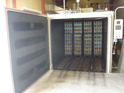 栽培で使われるコンテナ・ビン・キャップごと高圧窯に入れ100℃ 前後の温度で約6時間殺菌します。