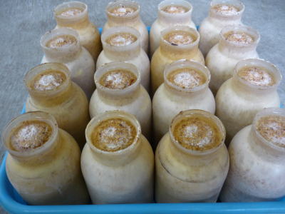 栽培において、一番月日がかかる重要な工程です。ここではビン 全体に菌糸が回るように、温度・湿度を一定に保ち約3か月間寝か せる作業です。